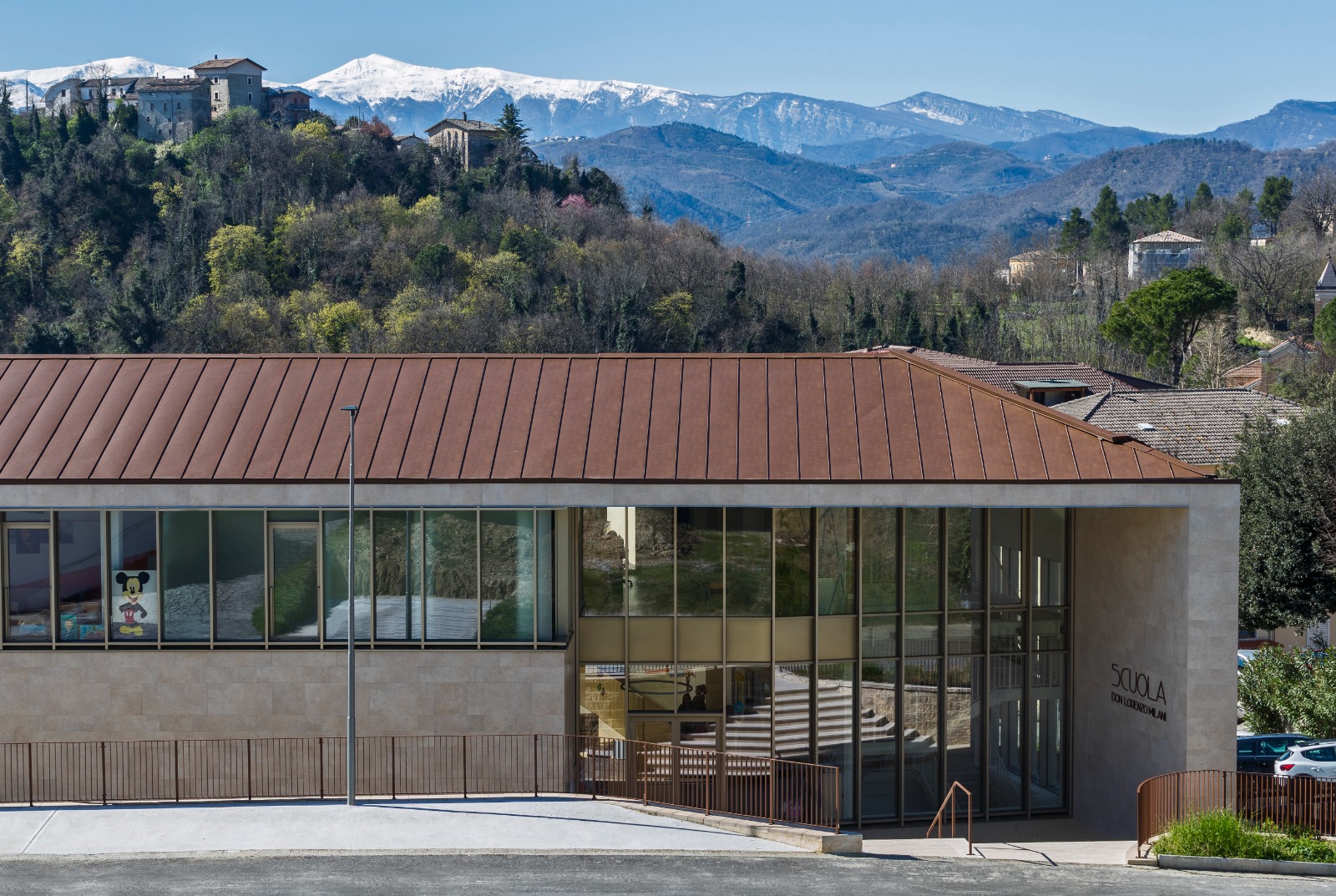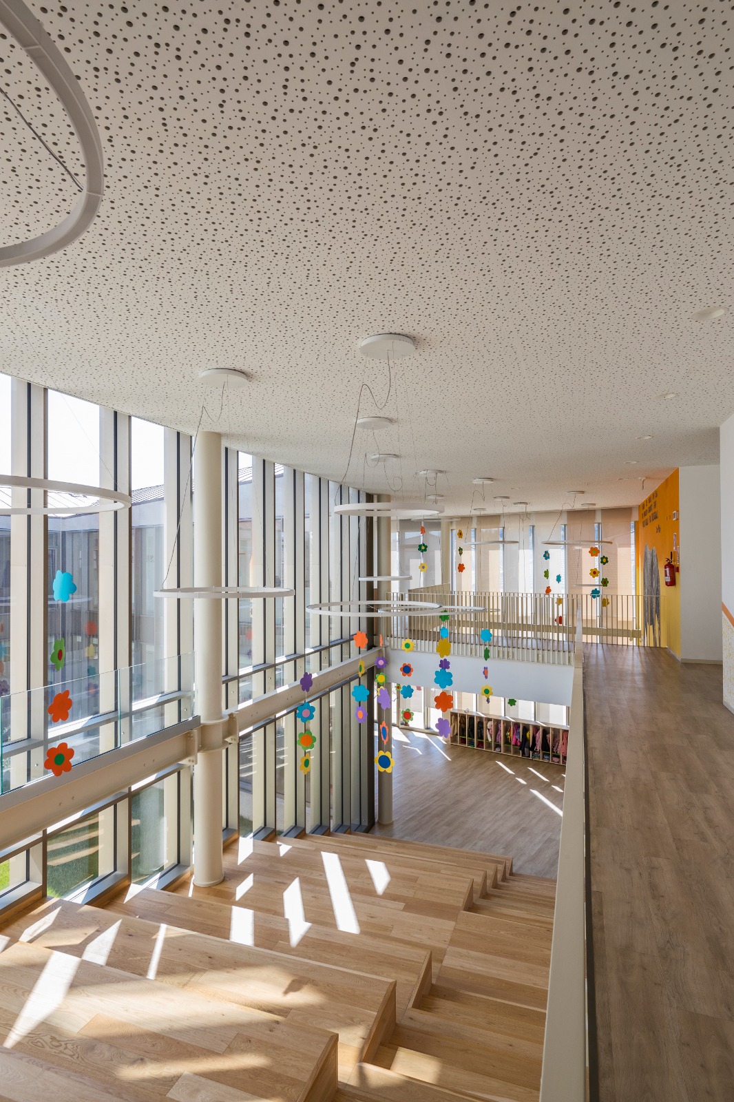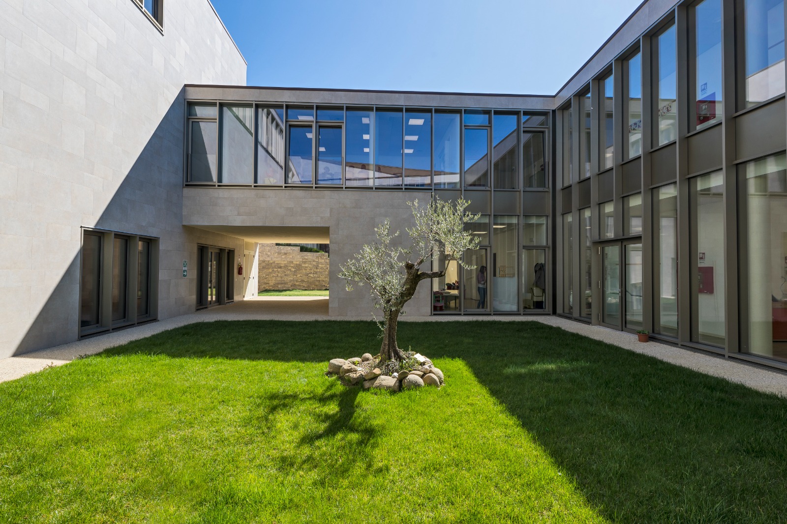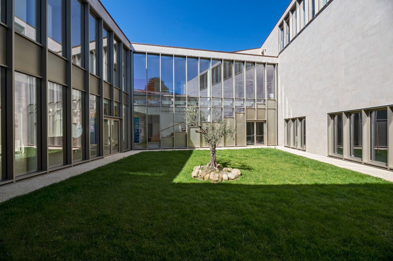 Gli spazi comuni con questi continui rimandi agli spazi interni ed esterni arricchiscono l’abitabilità del luogo anche in funzione didattica. Luoghi aperti, sensibili, permeabili, che mettono al centro gli studenti e la qualità degli spazi, come elemento cardine dell’apprendimento. Il contesto che li accoglie è articolato in spazi in grado di costruire occasioni, suggerire azioni per svolgere al meglio le diverse attività scolastiche ed extrascolastiche. Lo sguardo si perde tra campiture cromatiche per attività normali della materna e per le attività “speciali” (attività speciali, interciclo, parascolastiche e musicali) nelle elementari e medie.