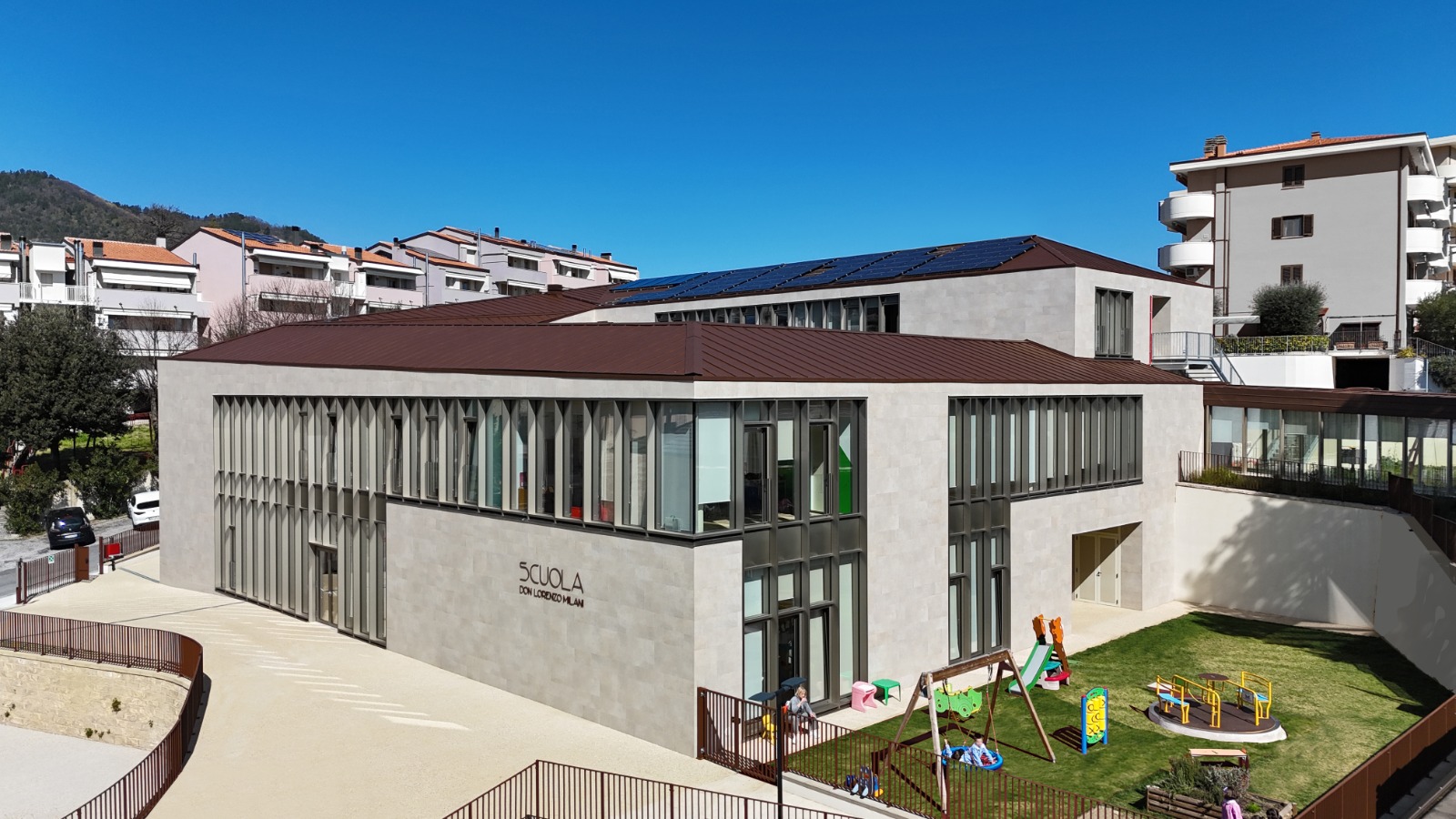 La scuola elementare si trova al piano primo, o piano terra da via Valentini parte alta, mentre la scuola media si trova all’ultimo piano che, a sua volta, è un primo piano dalla strada a monte.